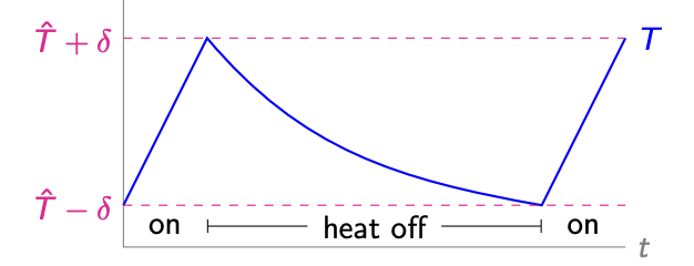 - This is what thermostatic control looks like (target temperature not shown) - sawtooth pattern between min/max targets. Typical when have heating/cooling equipment that can only be off/on: