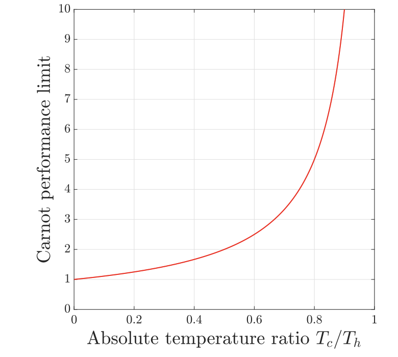 - Note that the curve is exponential, so you get increasing gains as you move to the right (smaller delta between source and destination temperature.) This is why heat pumps can struggle with extreme cold.