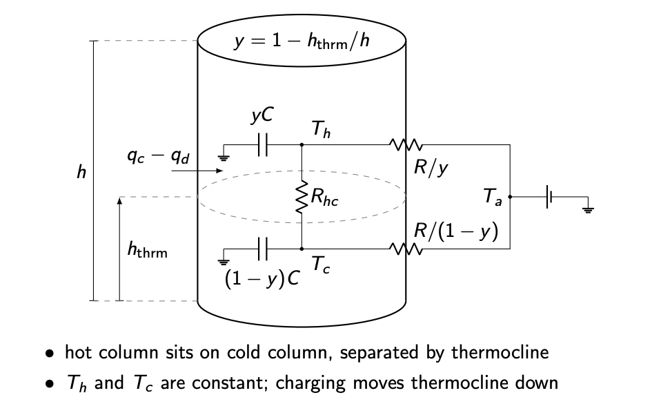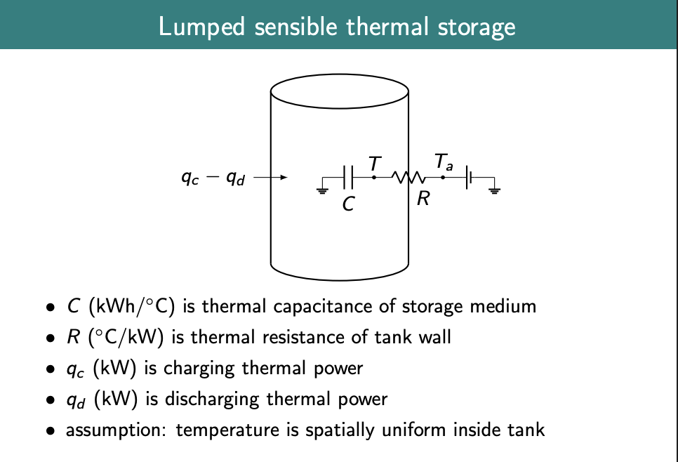 - Lumped sensible thermal storage: we heat something up to a uniform temperature, eg: a storage heater full of bricks.