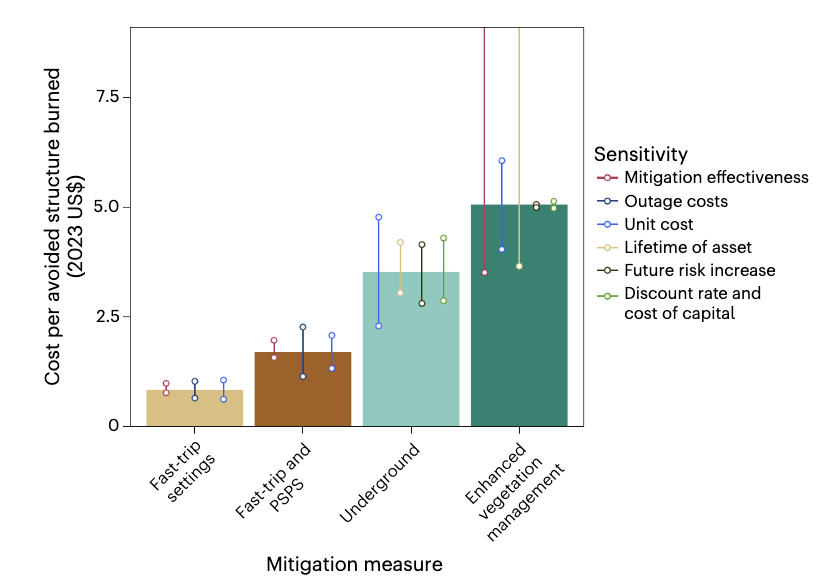 Abstract: Wildfire is among the fastest-growing economic risks of climate change, yet cost-effective adaptation strategies remain underexplored. In the electric power sector, where utility infrastructure has ignited some of the most destructive fires, companies are investing heavily to reduce risk. Here we evaluate the costs, reliability implications and risk-reduction benefits of the largest utility wildfire mitigation programme in the United States. Using weather and vegetation data for 25,000 miles of high-risk power lines, we develop a predictive model of ignition risk and compare outcomes across locations that had similar risk profiles but received different interventions. A newer strategy—adjusting protective device sensitivity during high-risk conditions—has reduced more wildfire risk at lower cost per avoided structure burned than conventional approaches such as undergrounding or vegetation management. Our results underscore the importance of comprehensive accounting of costs, risks and reliability when evaluating adaptation investments, particularly where capital-intensive measures may be over-incentivized.