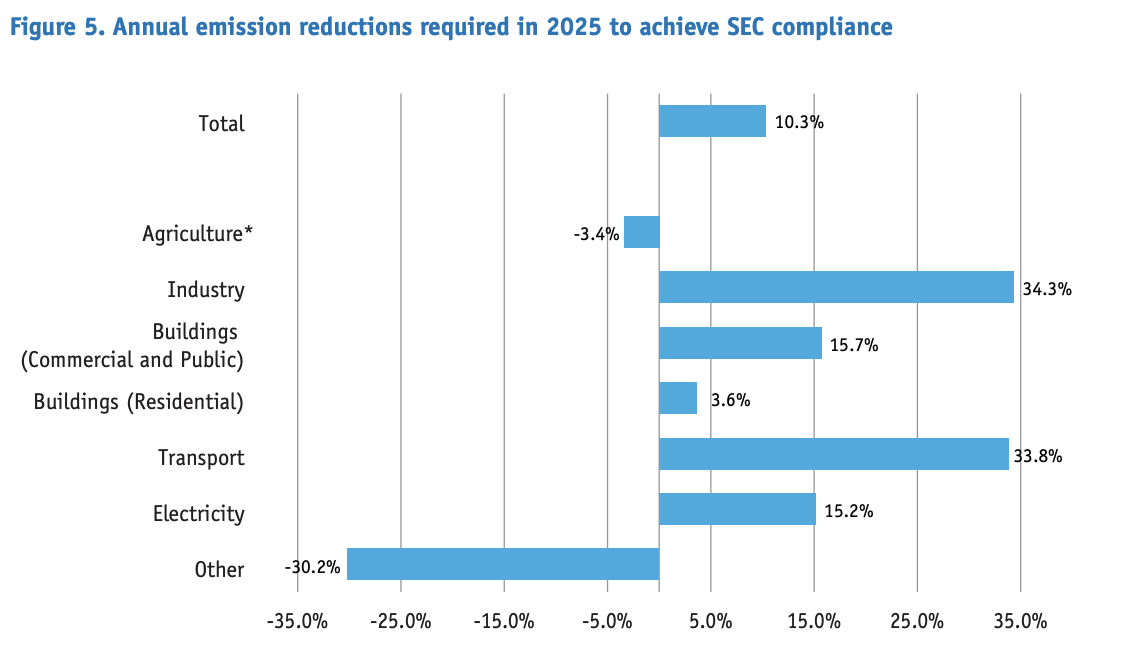 - Sectoral emissions ceilings: we need reductions of 15%, 34%, 34%, and 16% in 2025 for the Electricity, Industry, Transport and Buildings sectors keep within Sectoral Emissions Ceilings (SEC). Agricultural and ‘Other’ sectors can probably meet their SEC.