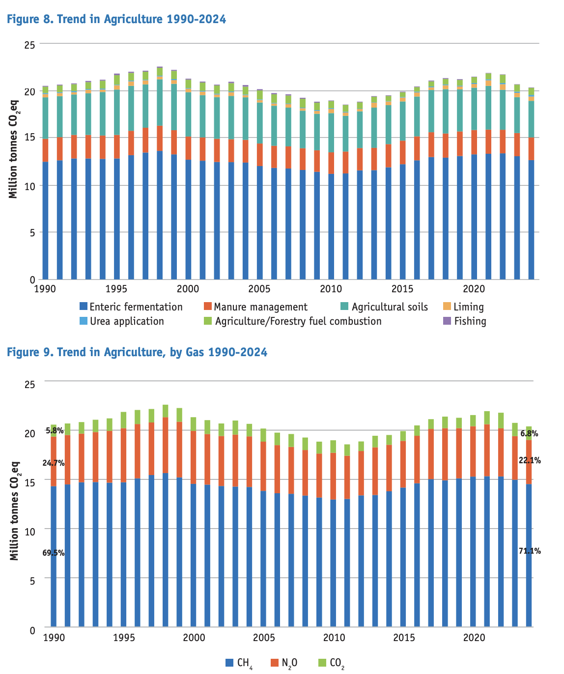 - 10.6% increase in fertiliser nitrogen use partially offset reduced cattle numbers on emissions.