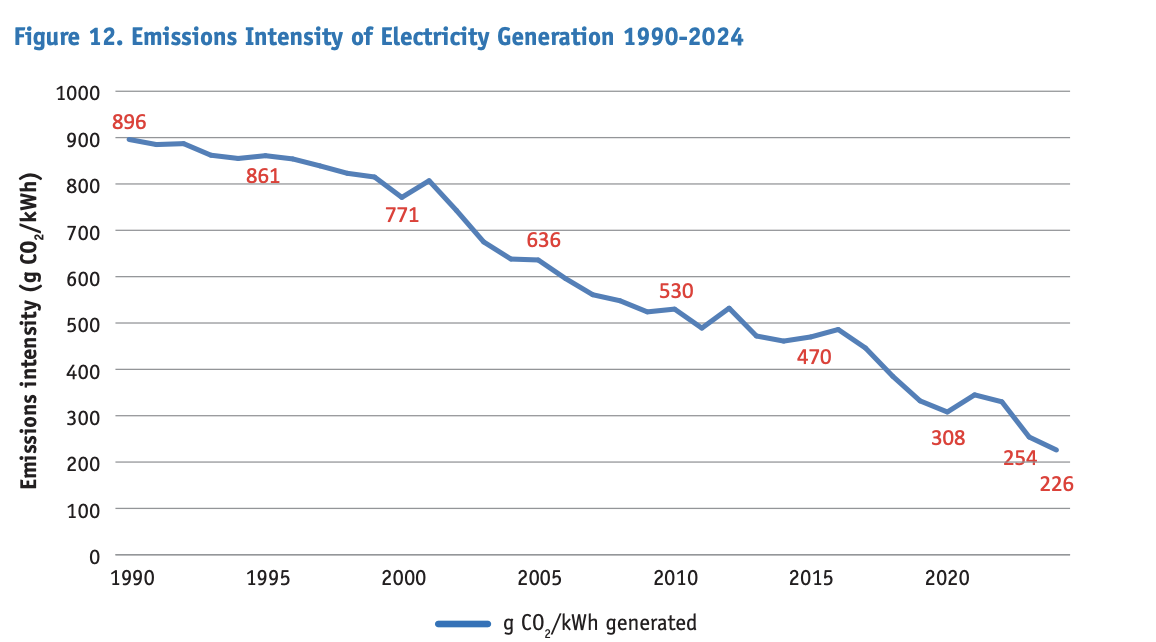 - Emissions intensity decreased to 226 g CO2/kWh vs 254 g CO2/kWh in 2023. It’s actually one of the more striking success stories of Ireland’s emission reduction efforts
