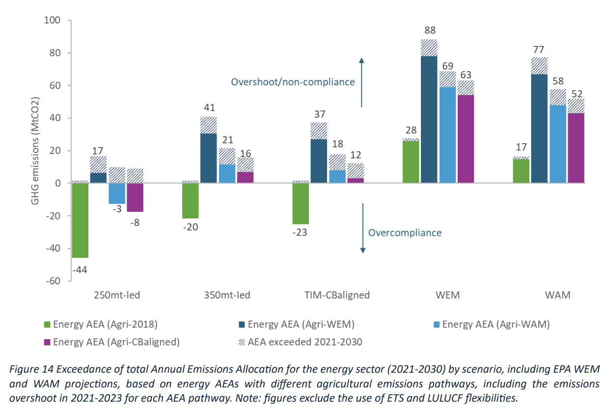 - In theory, use of ETS flexibility (19.1 MtCO2) to meet Agri-WAM and Agri-WAM for TIM-CBaligned. There is also a possible LULUCF flexibility of 13.4MtCO2 but it’s not clear if that will be available. Even the combined use of both flexibilities (32.5 MtCO2 in total) would be insufficient in the Agri-WEM/Agri-WAM scenarios