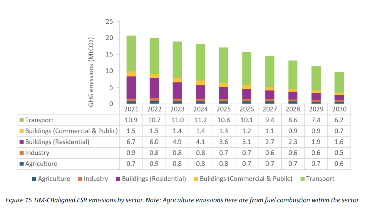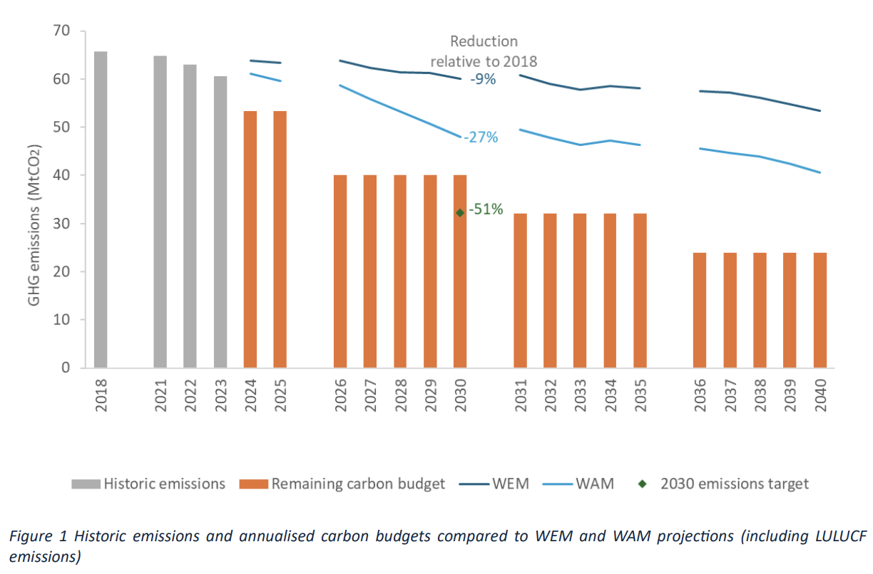 We are going to fall well short of our ESR commitments. The target is a 42% GHG reduction compared to 2005 levels by 2030. WEM has us hitting 9%(!!!), WAM is 26%. The scenarios based on current and proposed carbon budgets are better, but still breach our commitments.