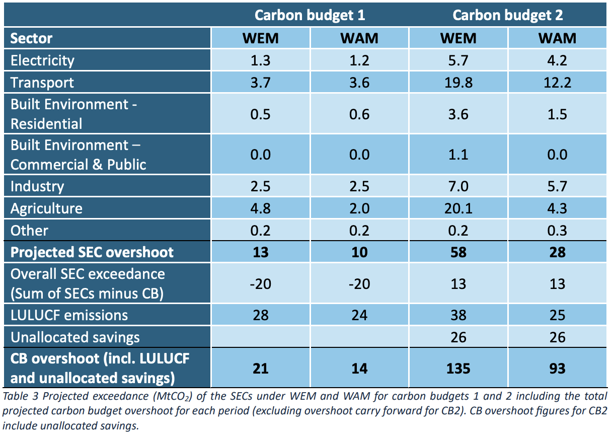 I think because agriculture has its own set of scenarios, the report does a somewhat complicated thing of showing how much the energy sector will overshoot/undershoot under different energy system scenarios and agriculture scenarios. Anyway, the answer is not good. There is basically one very ambitious/optimistic scenario where we keep below our targets. In the scenarios based on current and proposed carbon budgets we exceed our targets, and in the WEM/WAM scenarios we blow way way past them.