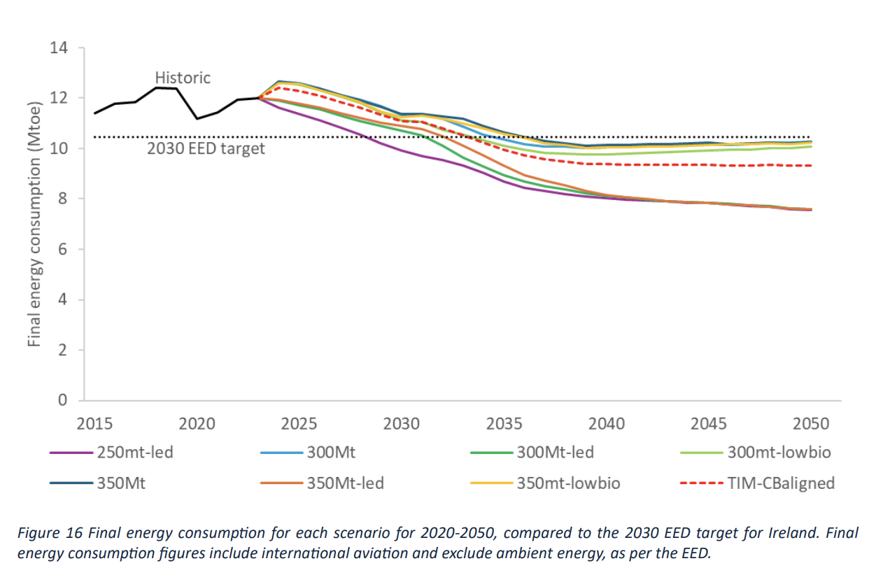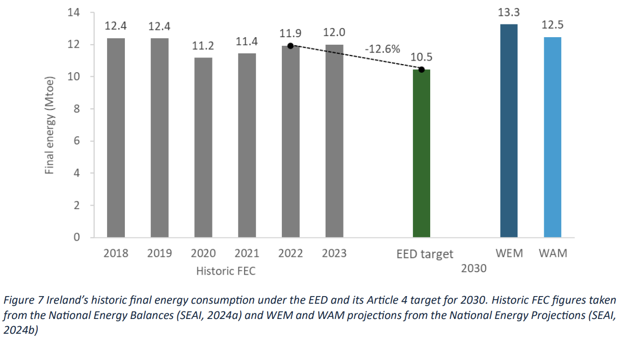 - Irish target for 2030 of 10.451 Mtoe, a 12.6% reduction on 2022 levels (so more aggressive than EU target, but not binding. Are we just trying to look good?).