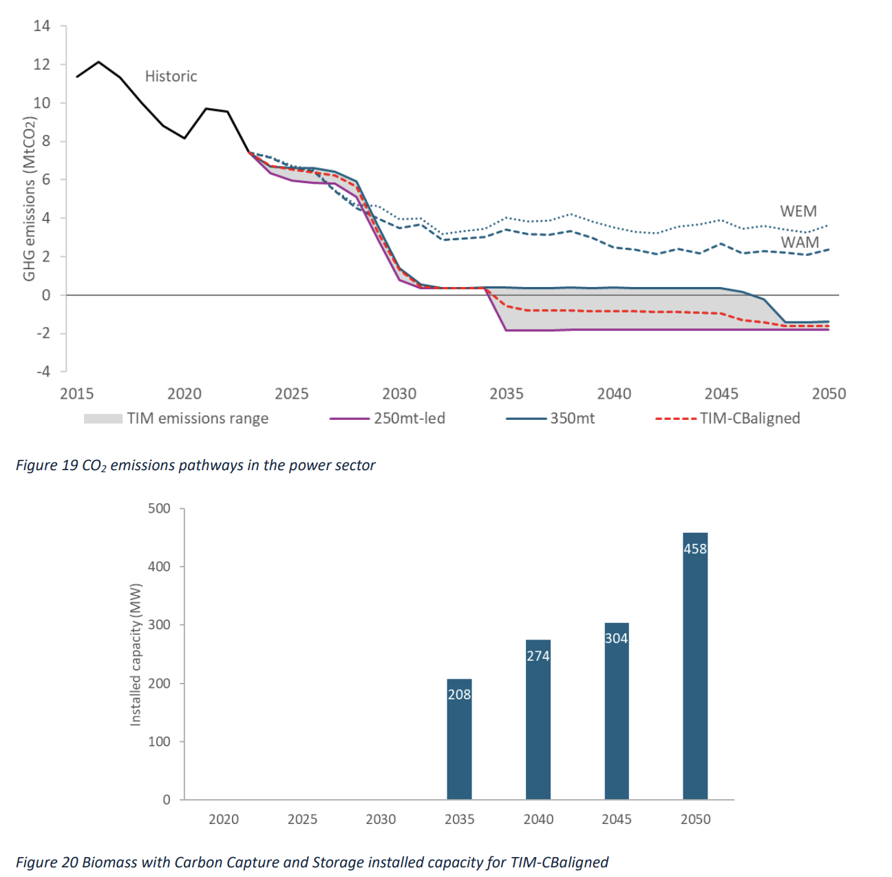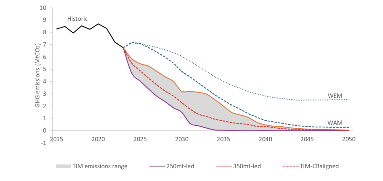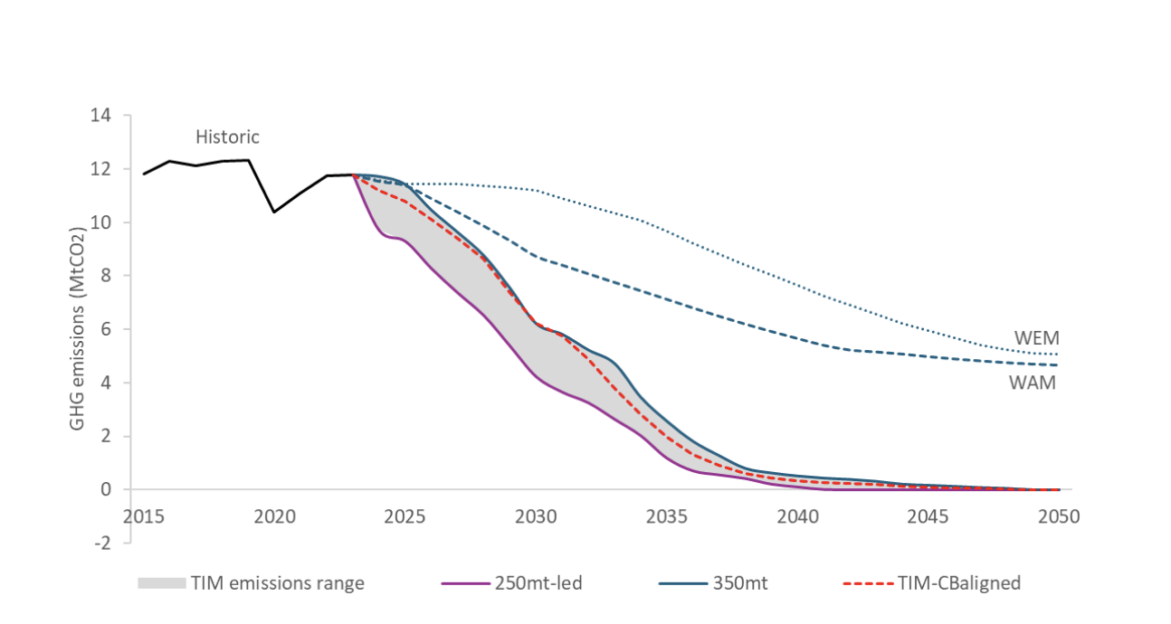 - Target: 61%. All CB scenarios surpass the 2030 emissions reduction target. TIM-CBaligned achieves a 77% decrease. WEM just misses, WAM achieves a 67% reduction.