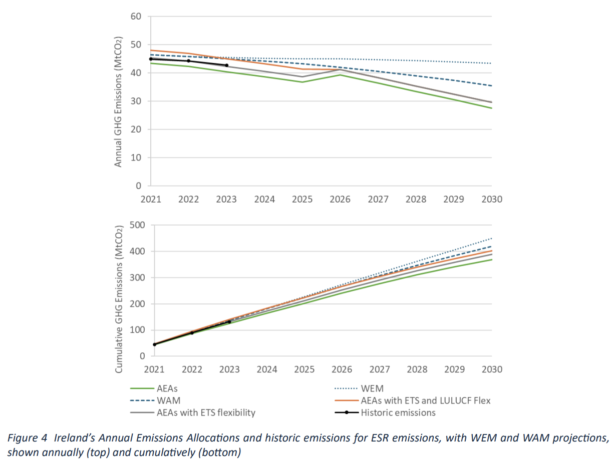 - LULUCF: based on credits from action undertaken in the LULUCF sector and is equivalent to 26.8 MtCO2eq from 2021-2030 for Ireland. However, there is a change in LULUCF accounting rules from 2026 which makes this uncertain so above graph only counts 2.68 MtCO2eq per year available up to 2025.