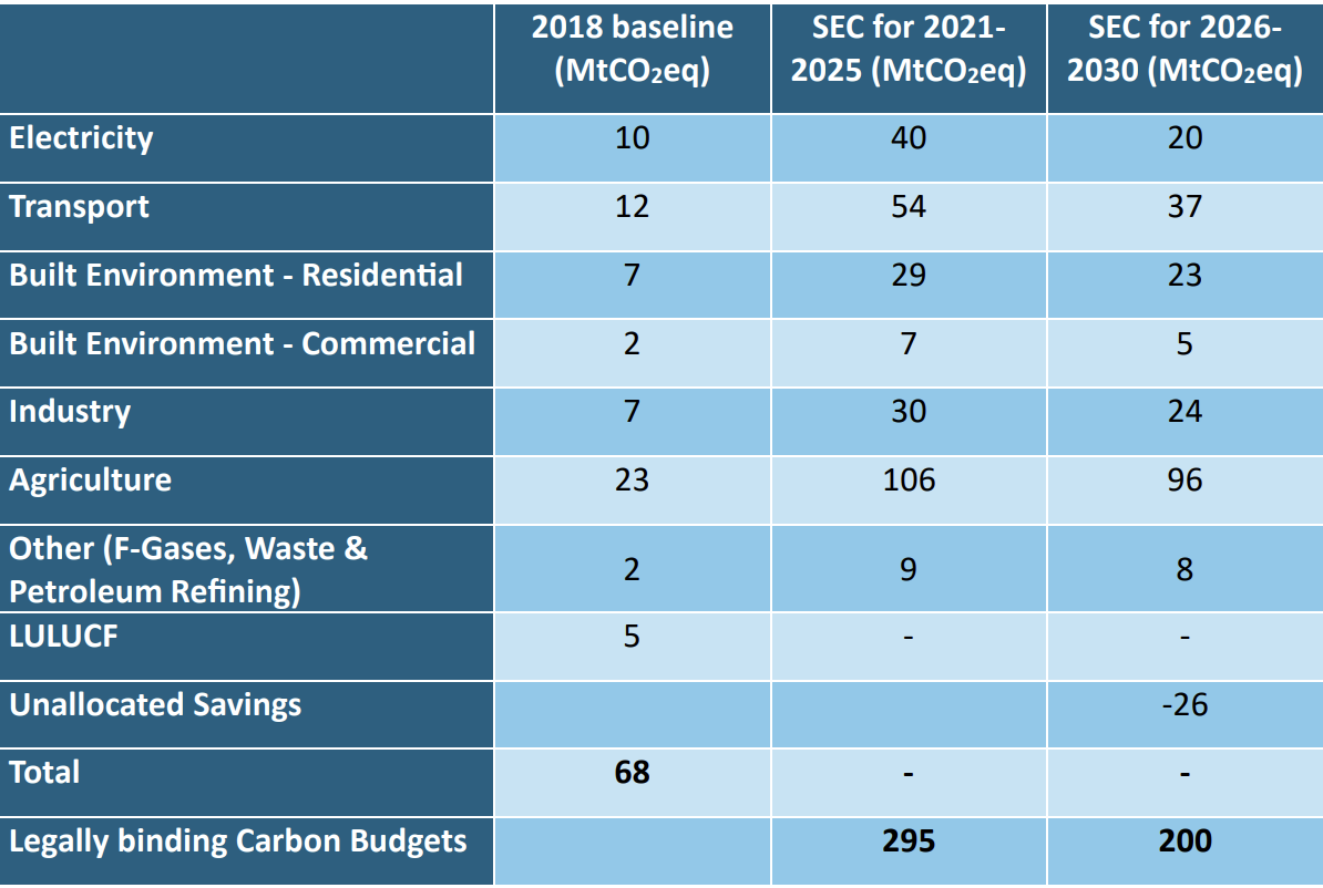 - The Minister for the Environment, Climate and Communications to prepare the SECs for each sector, to be submitted to approval to the Government after carbon budgets are approved.