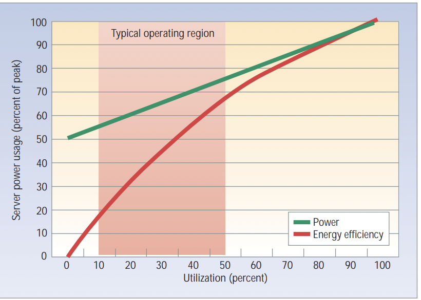 - An idle server consumes significant power, and power efficiency (compute per unit of power) is non-linear, with efficiency increasing as server utilisation goes up: ^7fda1e