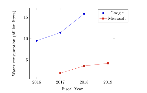 Here is the annual water consumption for Google and Microsoft (the only two hyperscalers publishing data at the time) from 2016 to 2018/2019: