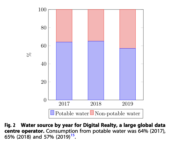Abstract: The information communication technology sector will experience huge growth over the coming years, with 29.3 billion devices expected online by 2030, up from 18.4 billion in 2018. To reliably support the online services used by these billions of users, data centres have been built around the world to provide the millions of servers they contain with access to power, cooling and internet connectivity. Whilst the energy consumption of these facilities regularly receives mainstream and academic coverage, analysis of their water consumption is scarce. Data centres consume water directly for cooling, in some cases 57% sourced from potable water, and indirectly through the water requirements of non-renewable electricity generation. Although in the USA, data centre water consumption (1.7 billion litres/day) is small compared to total water consumption (1218 billion litres/day), there are issues of transparency with less than a third of data centre operators measuring water consumption. This paper examines the water consumption of data centres, the measurement of that consumption, highlights the lack of data available to assess water efficiency, and discusses and where the industry is going in attempts to reduce future consumption.