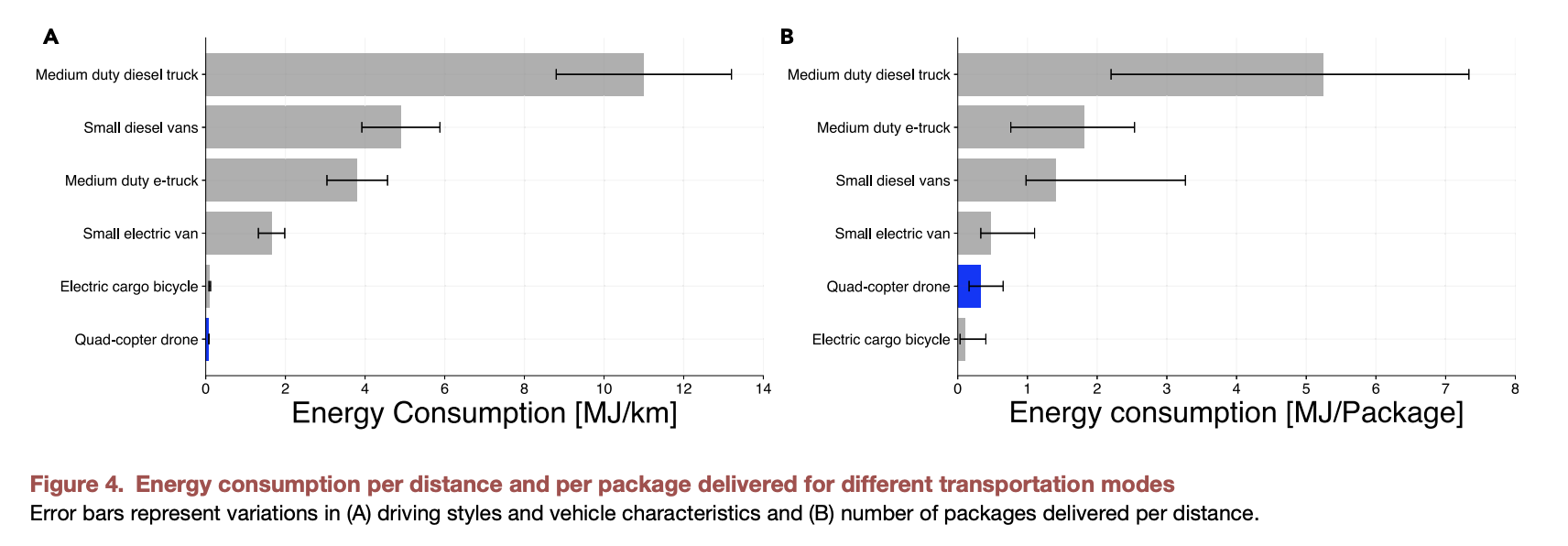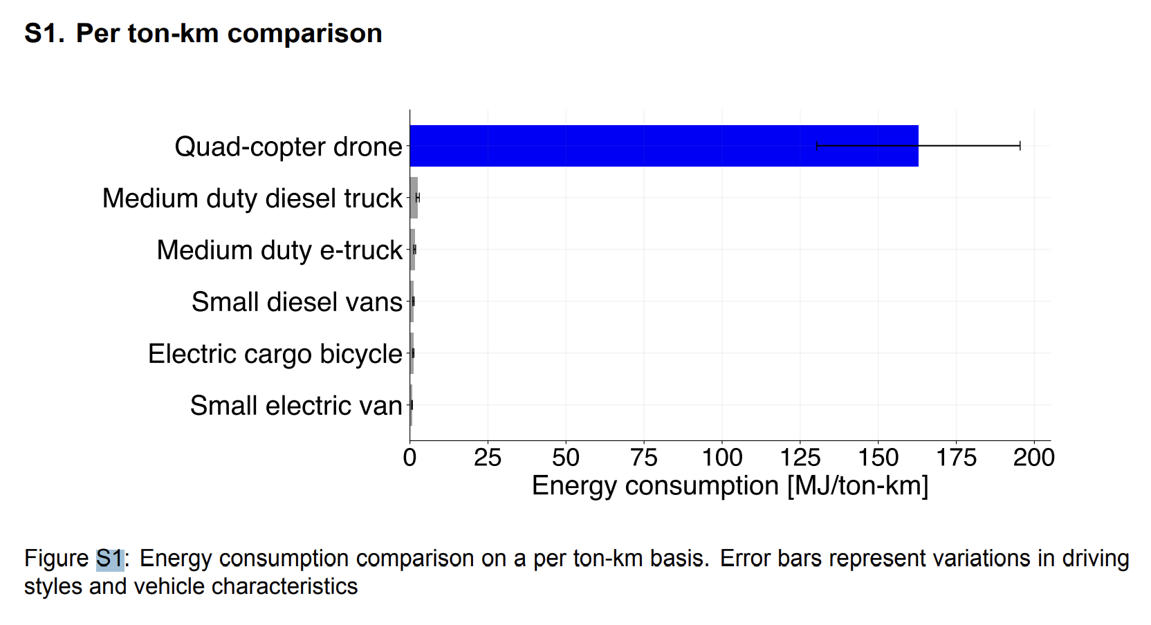It’s a couple of years old, and only looks at drones with small payloads (< 0.5kg). I was initially surprised at how much more efficient they are than most other delivery options (spoiler: not really), including electric vans.