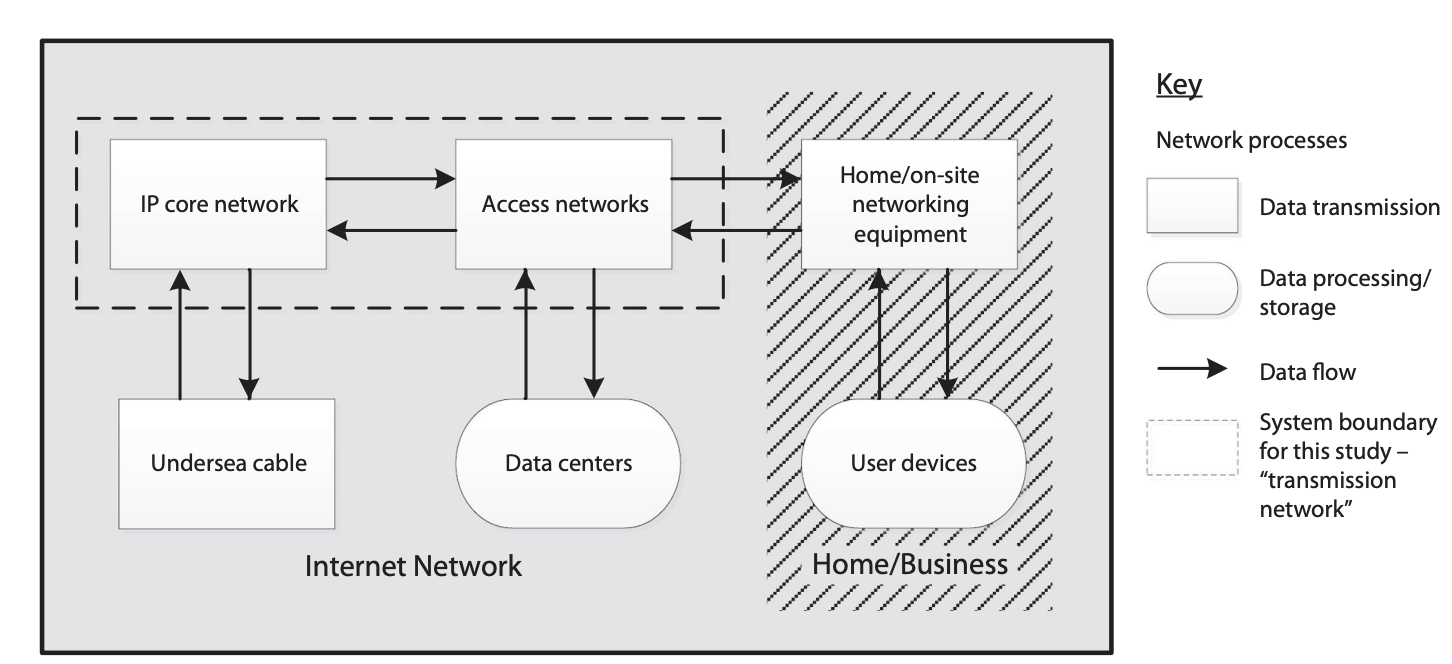 - HOWEVER, https://sustainablewebdesign.org/estimating-digital-emissions/ is using energy values from 2022, but data transfer values from 2023 (though you’d think this would make transmission look more efficient). It’s also possible that the two analyses are using different system boundaries, though on first reading it seems like they are both focusing on the dotted box in this diagram
