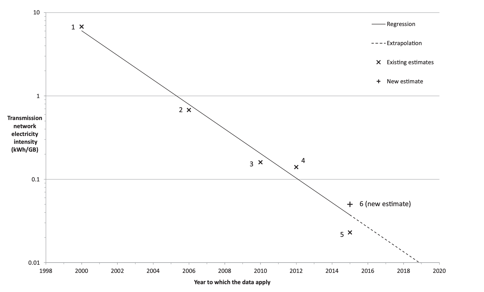 Abstract: In order to understand the electricity use of Internet services, it is important to have accurate estimates for the average electricity intensity of transmitting data through the Internet (measured as kilowatt-hours per gigabyte ((kWh/GB). This study identifies representative estimates for the average electricity intensity of fixed-line Internet transmission networks over time and suggests criteria for making accurate estimates in the future. Differences in system boundary, assumptions used, and year to which the data apply significantly affect such estimates. Surprisingly, methodology used is not a major source of error, as has been suggested in the past. This article derives criteria to identify accurate estimates over time and provides a new estimate of 0.06 kWh/GB for 2015. By retroactively applying our criteria to existing studies, we were able to determine that the electricity intensity of data transmission (core and fixed-line access networks) has decreased by half approximately every 2 years since 2000 (for developed countries), a rate of change comparable to that found in the efficiency of computing more generally.