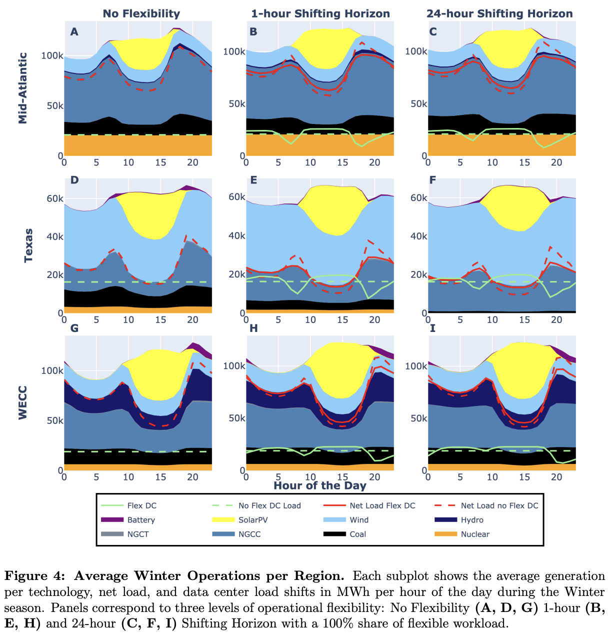 - In Texas where wind and solar are projected to supply 54% of generationm high levels of datacenter flexibility results in up to 40% lower CO2 emissions and accelerate retirements of coal and nuclear plants. This reverses in the Mid-Atlantic and WECC where renewable penetration is lower, coal units that survive retirements can run more uniformly, and system-wide emissions rise by as much as 3%, even though costs still fall.