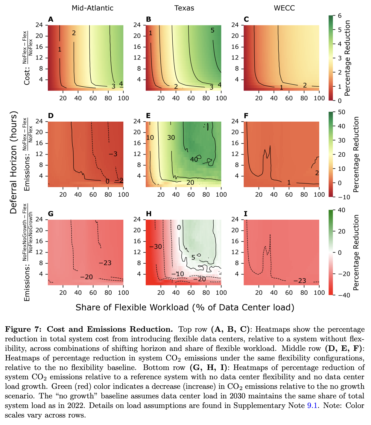 - BUT “Second, datacenter flexibility supports baseload operations. By flattening net load profiles, datacenter flexibility makes it more cost-effective to run inflexible baseload plants like coal with fewer ramping requirements…In contrast, in systems with a large share of existing coal and relatively limited VRE (variable renewable energy) availability, flexibility tends to shift load toward cheap, carbon-intensive baseload generation, which raises emissions even as costs fall”.