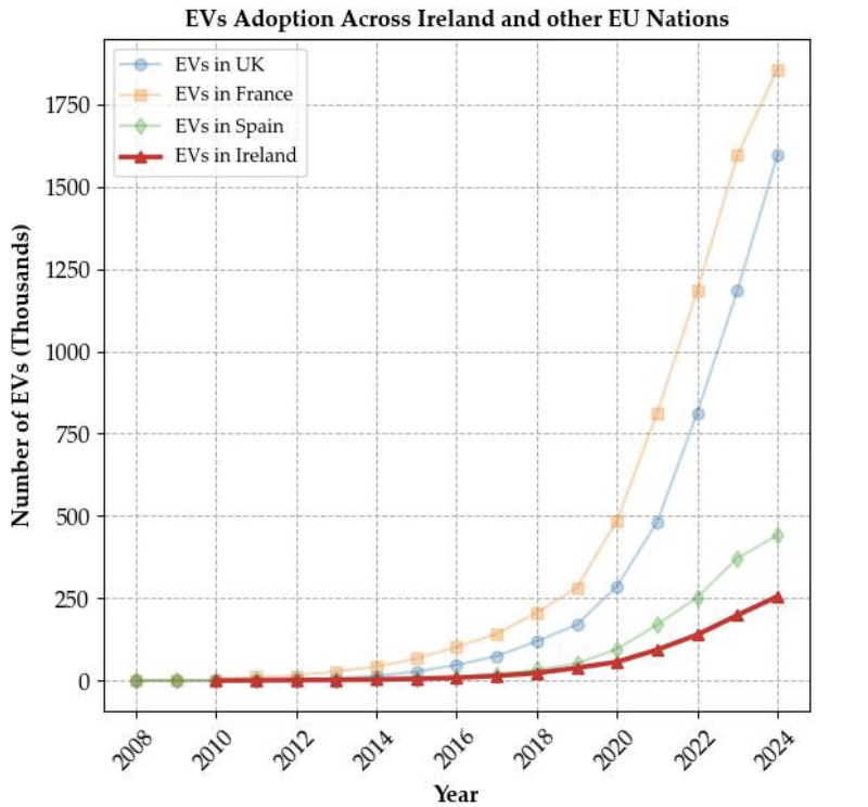 - CAP (Climate Action Plan) aims to achieve a target of 845,000 private EVs and 100,000 light goods EVs by 2030, bringing the total to 945,000 EVs. Supported by an allocation of €200 million under Project Ireland 2040.