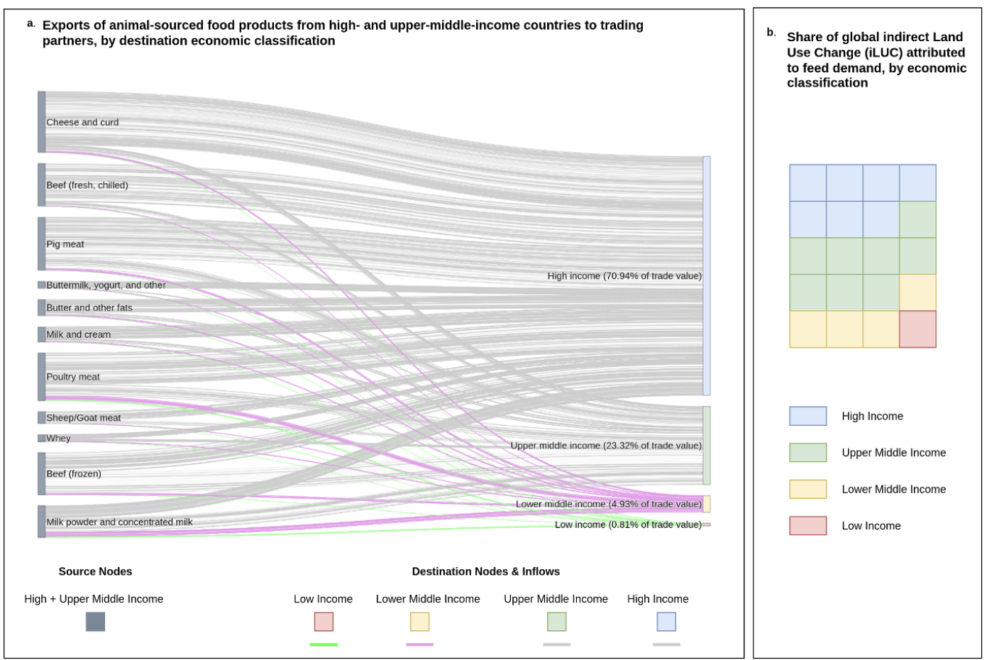 There is very little exporting of animal-sourced food products from higher to lower income countries, and 75% of global indirect land use change for animal feed is for higher income countries. This suggests that animal agriculture in wealthier countries constrains land availability and raises food prices in the poorer countries.