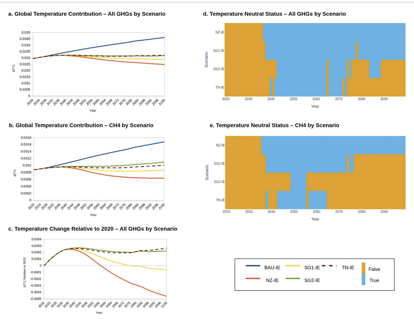 - Compares TN (temperature neutral), two split-gas (SG), NZ (net-zero), BAU (business as usual) scenarios.